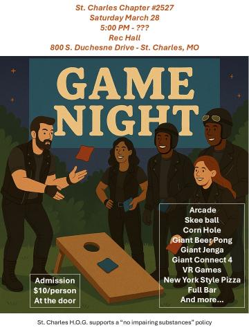 Join us for a fun night of games with your Harley friends at the Rec Hall in St. Charles.
